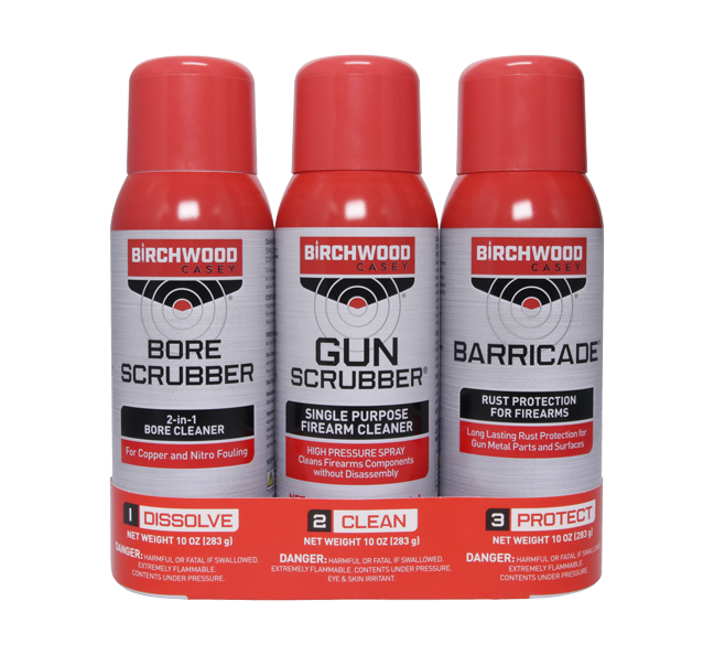 Gun cleaning made simple. 3 easy steps to clean your firearm: dissolve, clean and protect. First, use Bore Scrubber® to dissolve copper fouling and residue left behind from firing your firearm. Second, clean out the dissolved material with Gun Scrubber®. And, third, cover with Barricade® to protect your firearm from rusting.